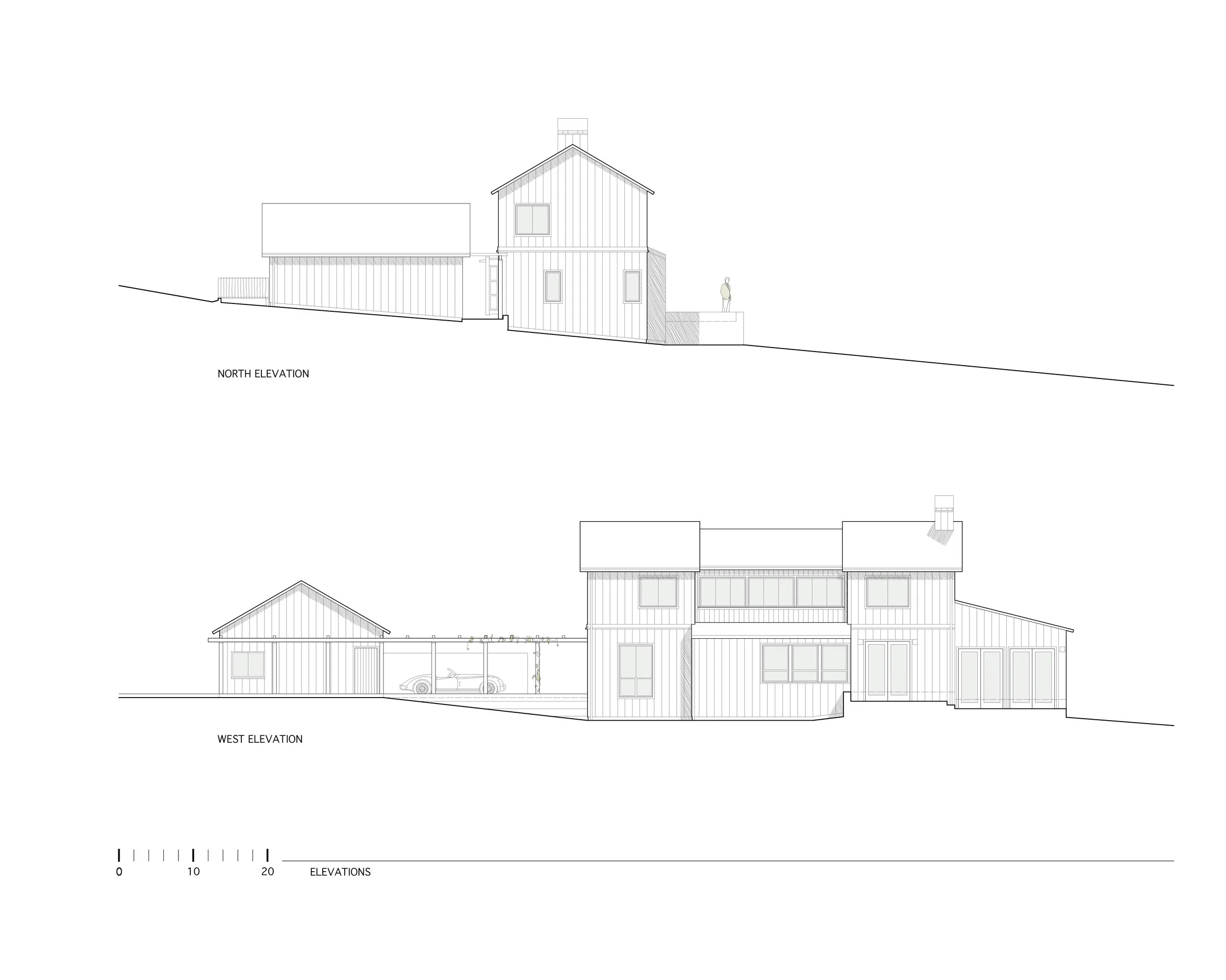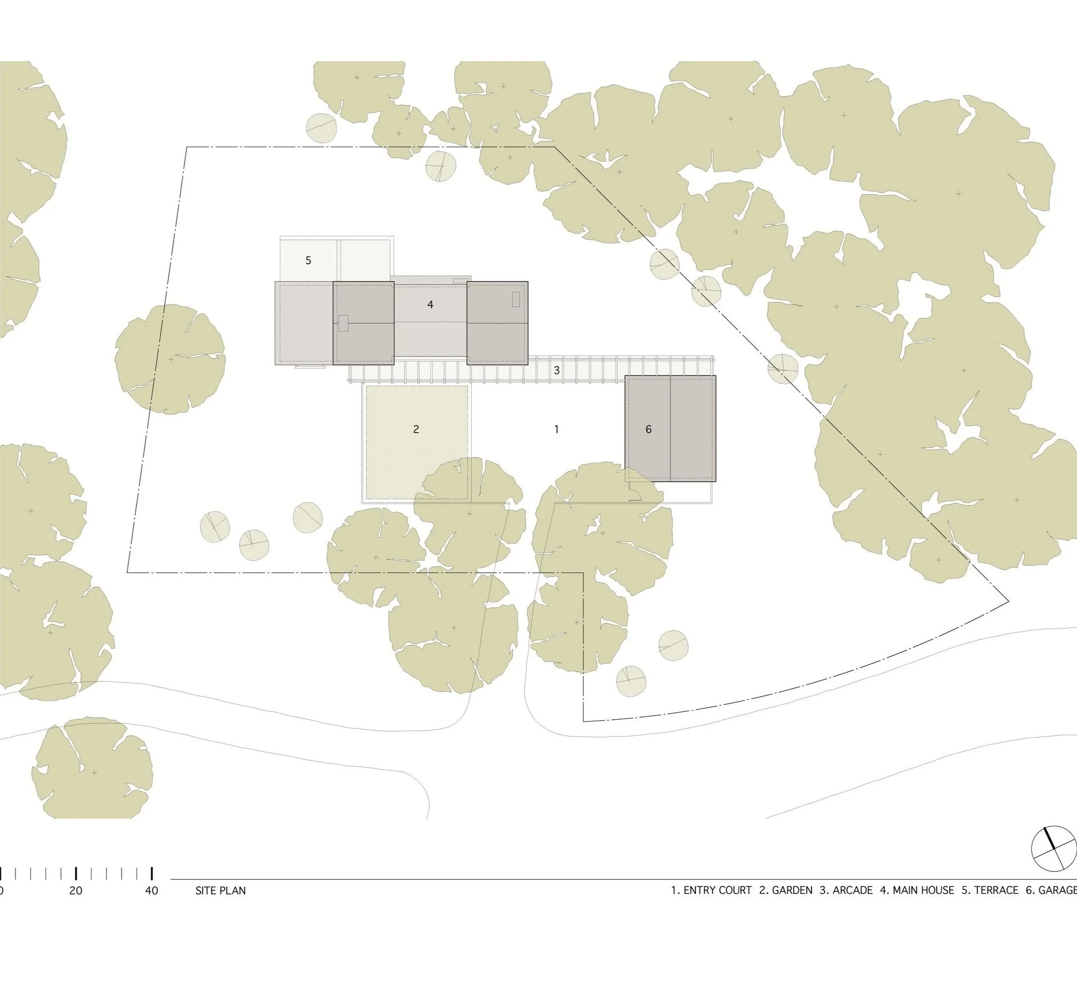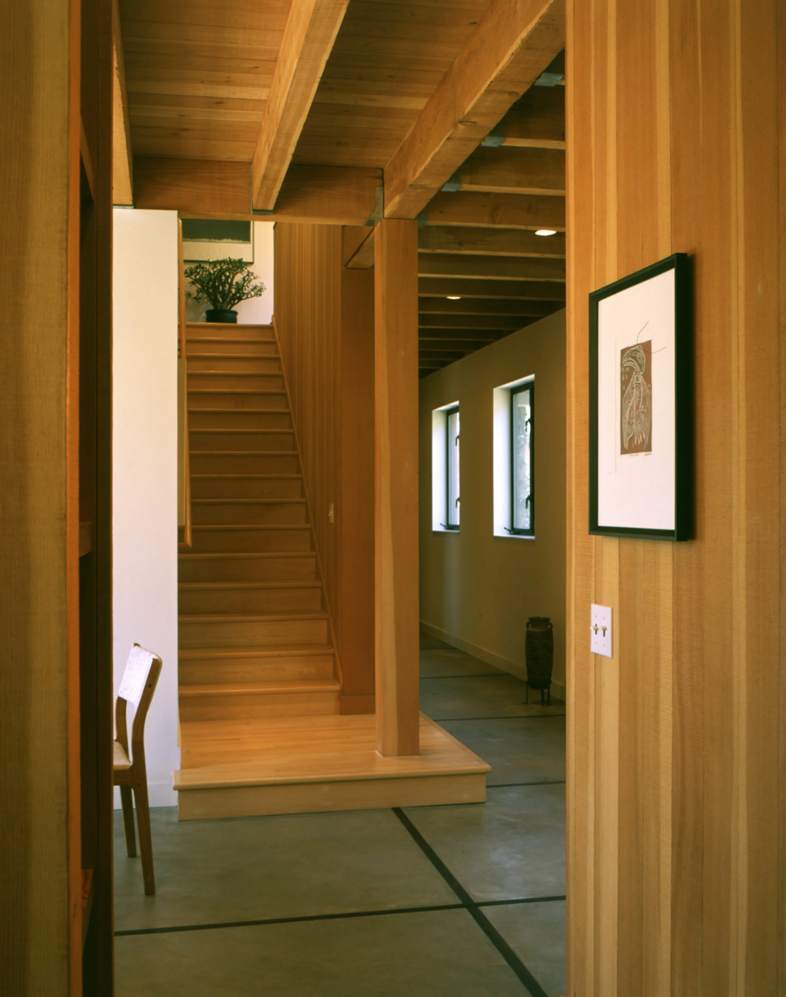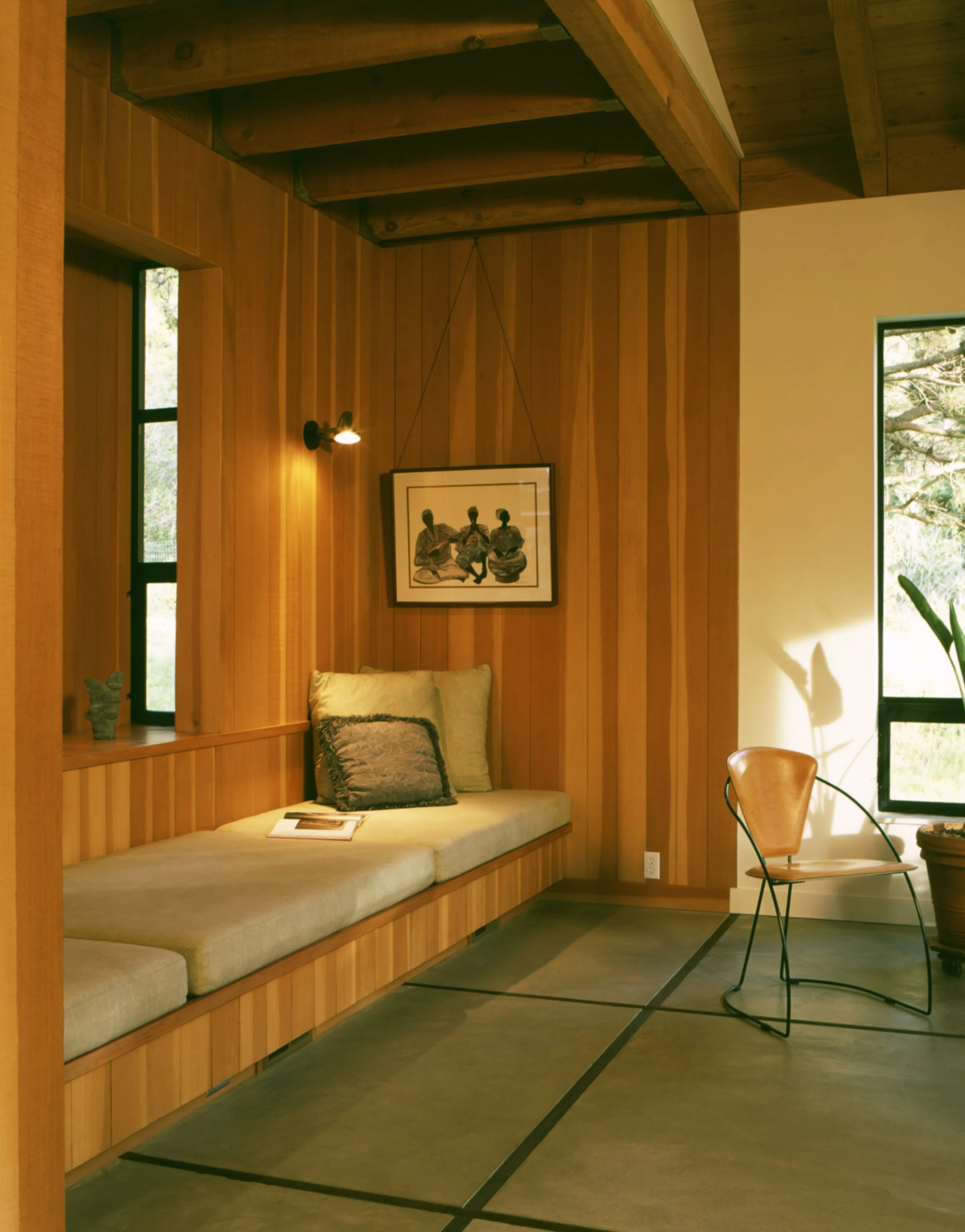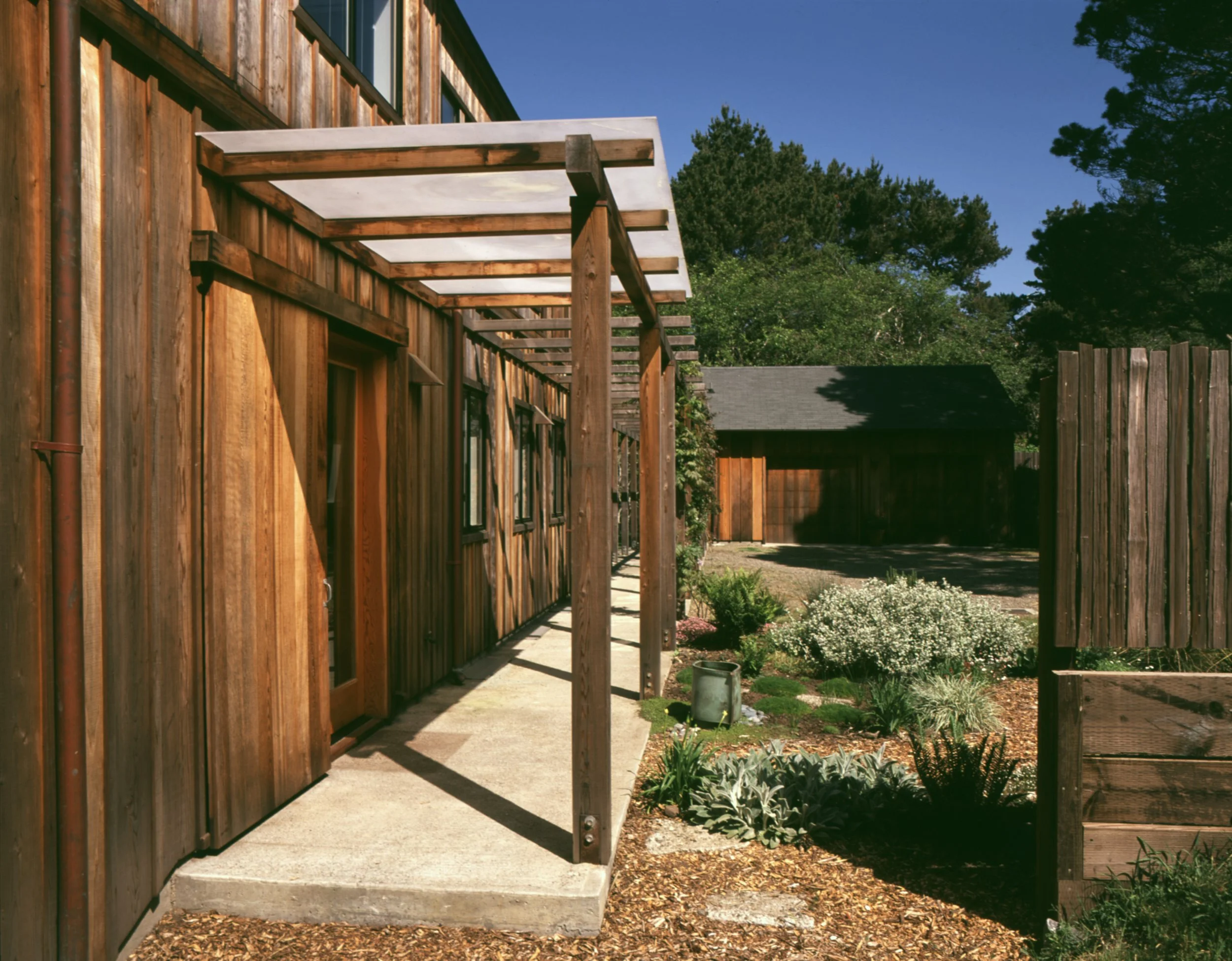 Located in a beautiful and secluded glade, this house is sited around an entry court that is bounded by the house, the garage, an arcade, a redwood grape stake fence, and the edges of the glade itself. The interior of the house utilizes exposed structure, concrete floors, and planes of clear cedar to reinforce a sense of spatial clarity and to provide material richness.